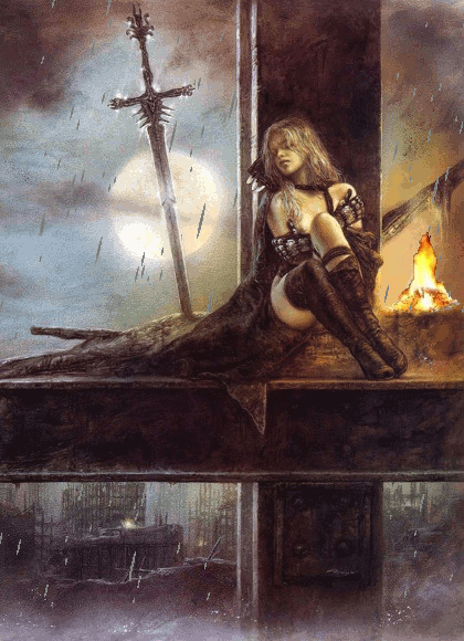 Belle femme dans un univers apocalyptique, se réchauffant auprès d'un bon feu et à l'abri de la pluie!